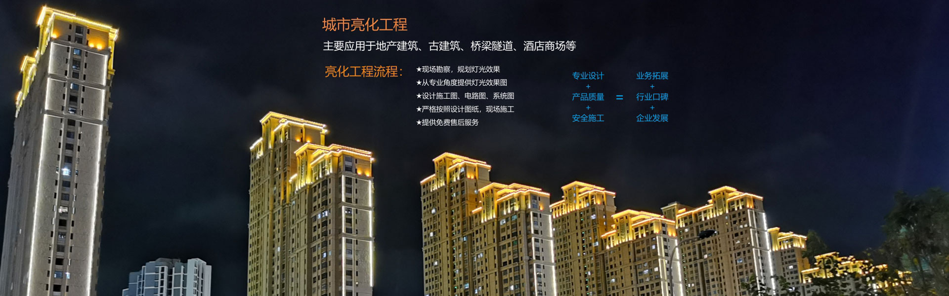 城市亮化工程,燈光工程以人為本,特別是作為住宅區(qū)的燈光工程,必須做到服務(wù)于人而不影響生活,使用安全、安裝美觀、融入環(huán)境、···
